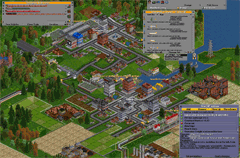 This picture focuses on some of the new GUI elements of 0.5.0. For the first time we see the in-game NewGRF gui allowing graphical GRF selection, a huge step towards user friendliness. A new colour scheme window, supporting 2CC’s (Two Company Colours) is also present; effects can be seen on the Fokker F.VII in the aircraft list. From the vehicle lists (or the depot for some actions) you can now mass-manage your fleet. Mass start/stop, sell, send to depot, etc. all just a click away. Pretty nifty.